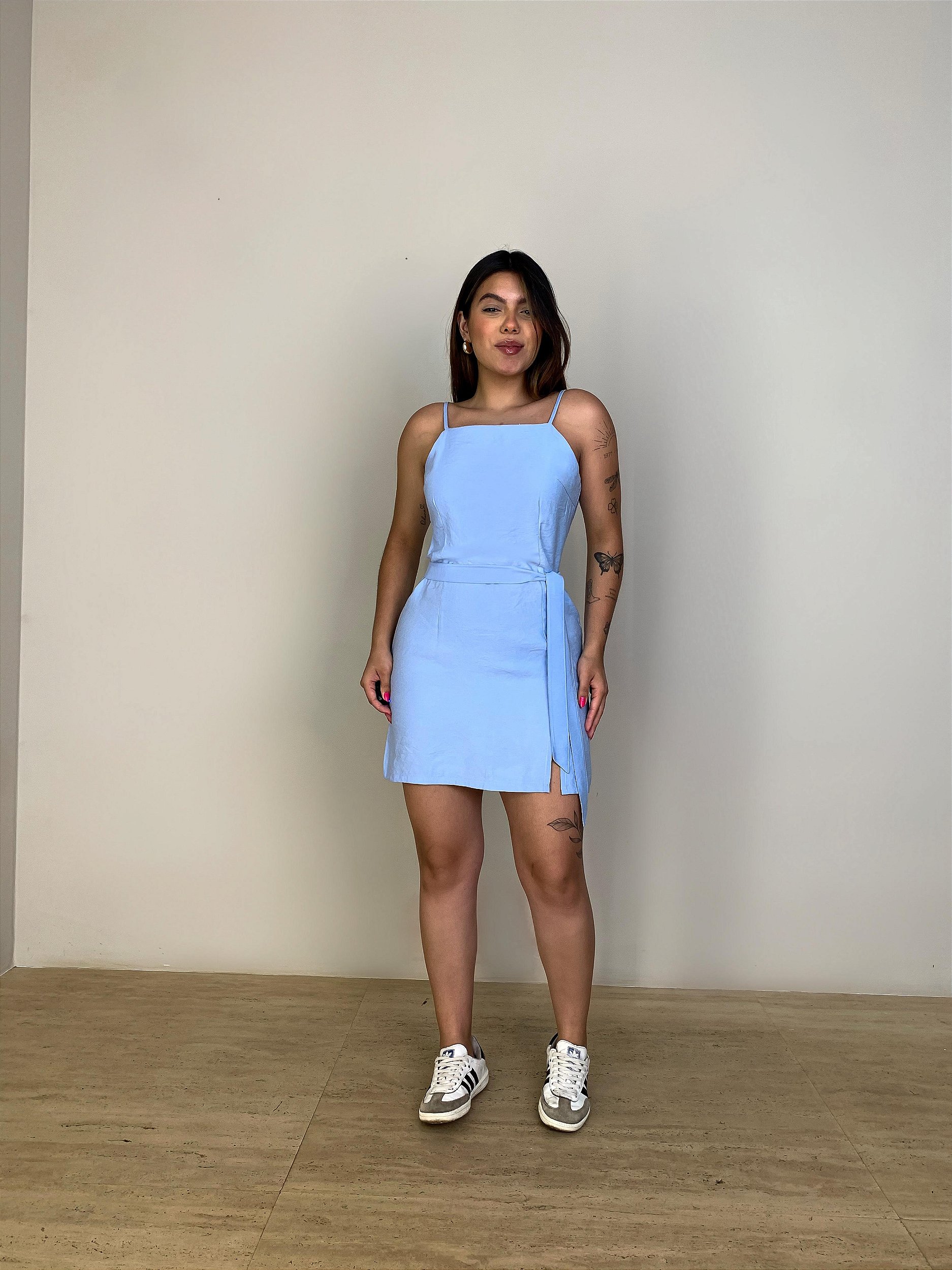 Vestido curto azul claro, leve e versátil. Com alças finas reguláveis e fechamento por zíper nas costas, é a escolha perfeita para produções práticas e estilosas. Apresenta modelagem ajustada, fenda lateral e tecido liocel de toque suave, que garante conforto e caimento impecável. Ideal para compor looks casuais ou sofisticados, conforme os acessórios.