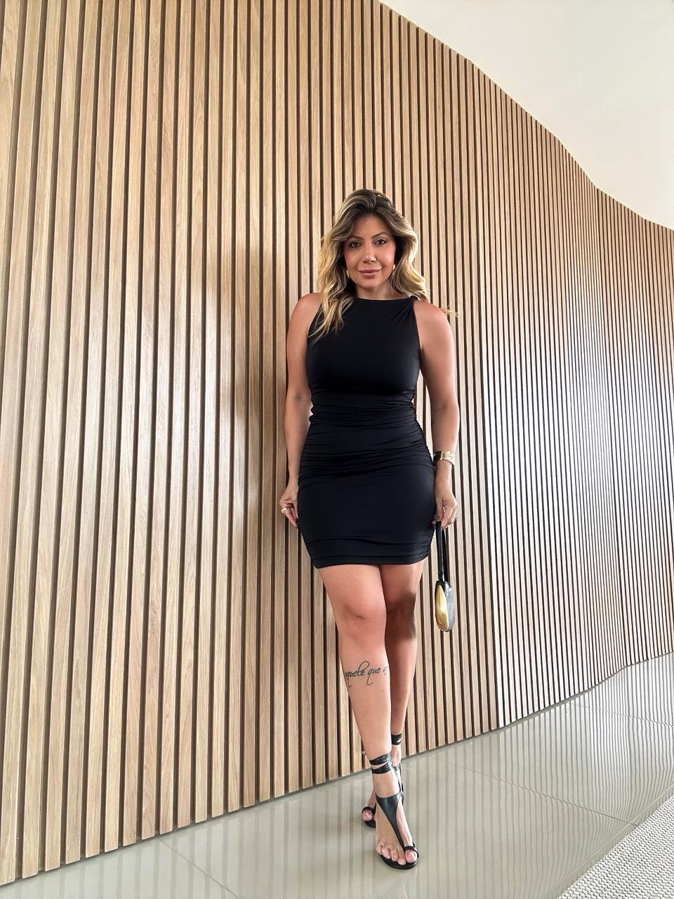 Vestido curto preto inteiramente drapeado, trazendo textura que valoriza a silhueta de forma elegante. O modelo possui caimento justo, equilibrando modernidade e sensualidade com um toque sofisticado. Confeccionado em poliamida, todo duplo, ele acompanha faixa multifuncional.
