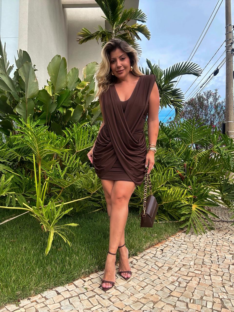 Vestido marrom confeccionado em poliamida com modelagem curta e poderosa, apresenta ombreiras estruturadas que valorizam o caimento nos ombros e transpasse em X, criando uma silhueta elegante e imponente. Possui drapeados estratégicos nas laterais e também nas costas. É uma peça versátil, que vai do jantar ao evento especial, da balada à festa chique.