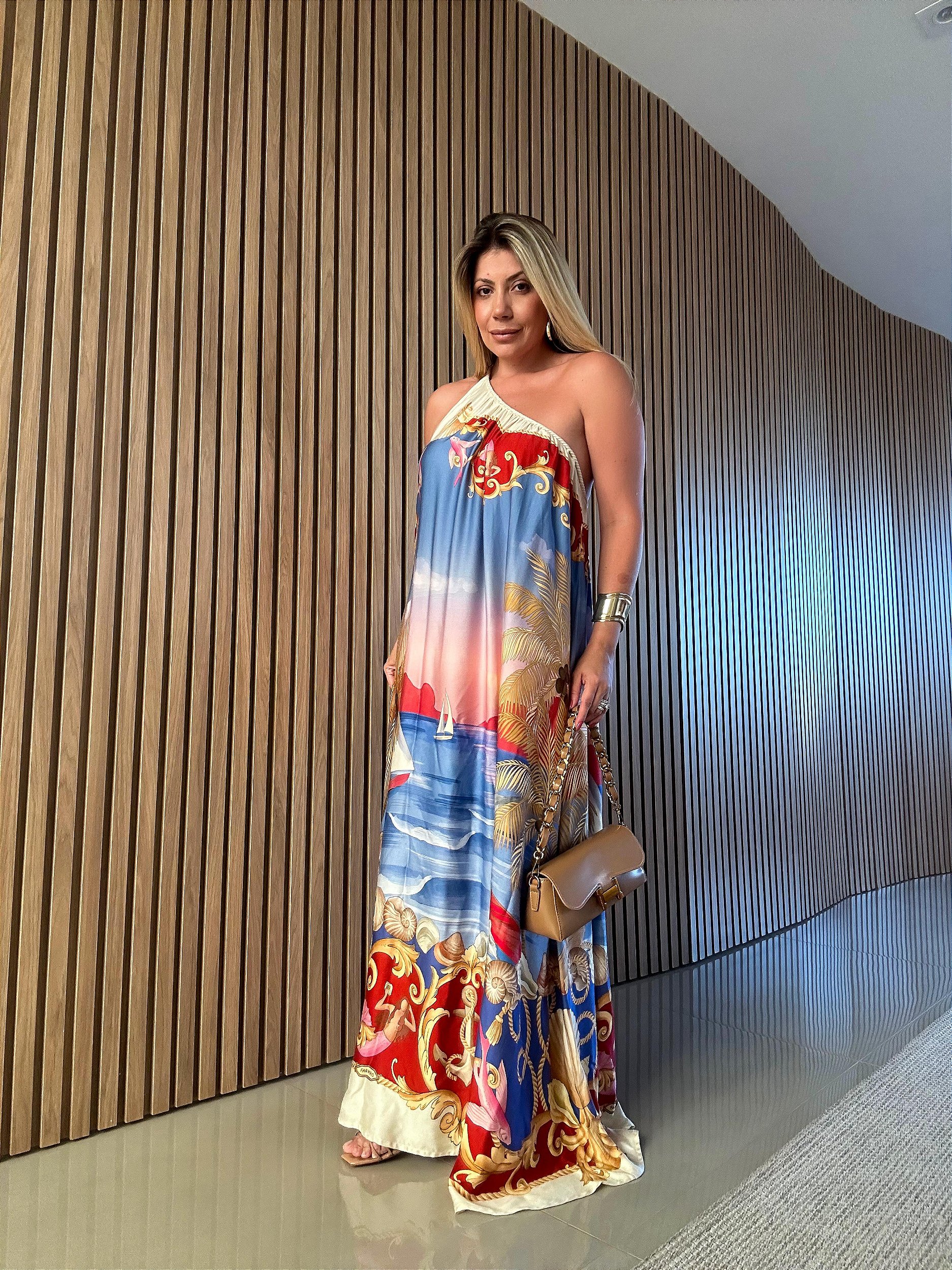 Vestido estampado realeza do mar farm com modelagem ampla e fluida. A peça traz decote de um ombro só com alça fina, perfeito para dias ensolarados ou ocasiões especiais a beira-mar. Tecido viscose.