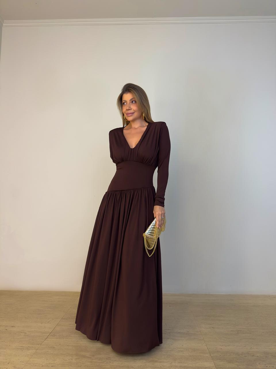 Esse vestido longo marrom com ombreiras é a escolha perfeita para ocasiões especiais. Com decote em V, mangas longas e modelagem que valoriza a silhueta, a peça transmite sofisticação com um toque de sensualidade na medida certa. O detalhe franzido na parte superior realça o busto, enquanto a saia fluida garante movimento e leveza ao visual. Tecido poliamida.