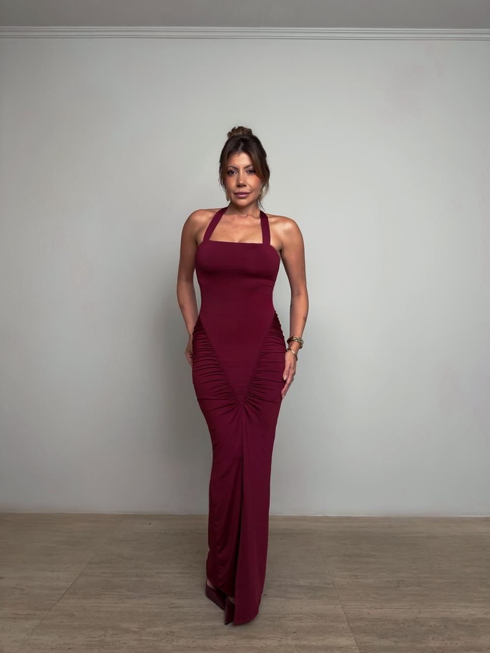 Vestido longo bordô, com design elegante e fenda frontal. Possui modelagem ajustada ao corpo que valoriza a silhueta, com drapeados estratégicos na região da cintura que proporcionam um efeito sofisticado. O decote halter com alças realça os ombros e o colo, trazendo um toque moderno e sensual na medida certa. Confeccionado em poliamida, possui forro.