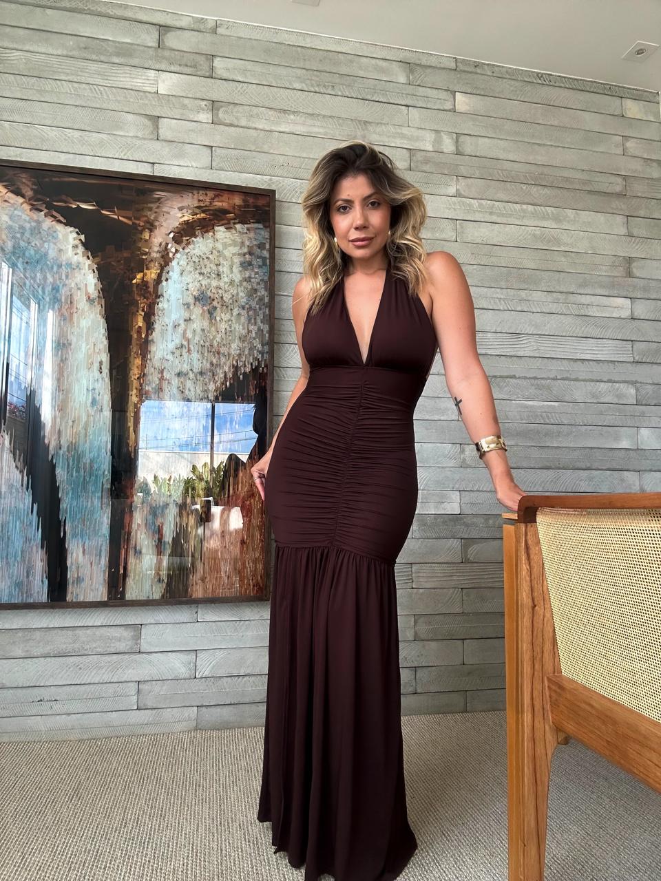 Vestido longo marrom deslumbrante, com modelagem que valoriza a silhueta e traz um caimento elegante. A peça é frente única, possui bojo estruturado e tem amarração no pescoço, garantindo sustentação e um charme extra. O decote nas costas acrescenta sensualidade na medida certa, enquanto a saia longa com leve abertura e movimento cria um visual sofisticado para eventos especiais. Confeccionado em poliamida com elastano.