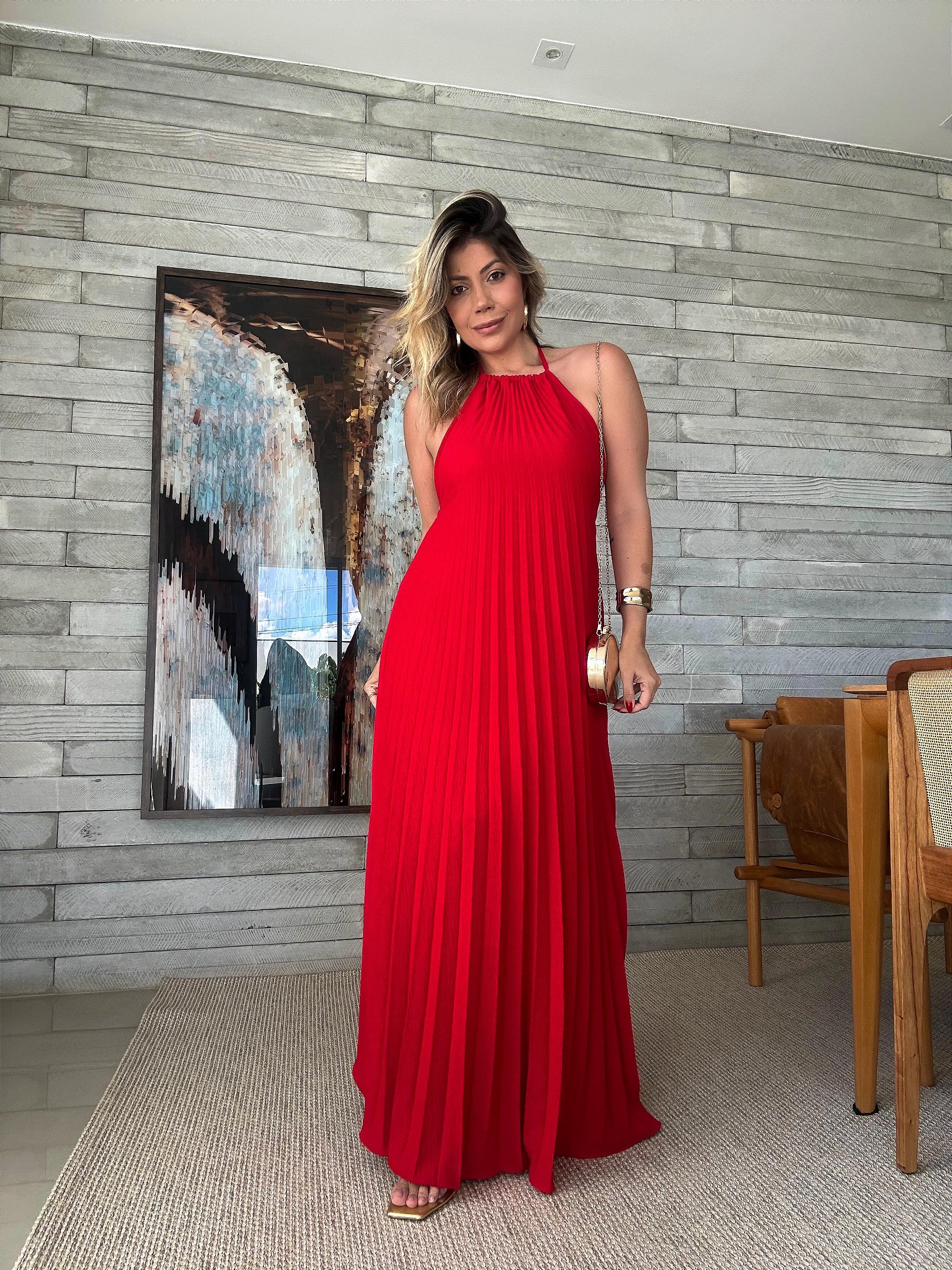 Vestido longo plissado vermelho deslumbrante, perfeito para ocasiões especiais. O modelo possui cava entrada com amarração, que valoriza os ombros e traz um toque elegante. A saia cria movimento fluido e sofisticado a cada passo, enquanto o caimento leve garante conforto e charme. Possui decote nas costas com ajuste, confeccionado em crepe.