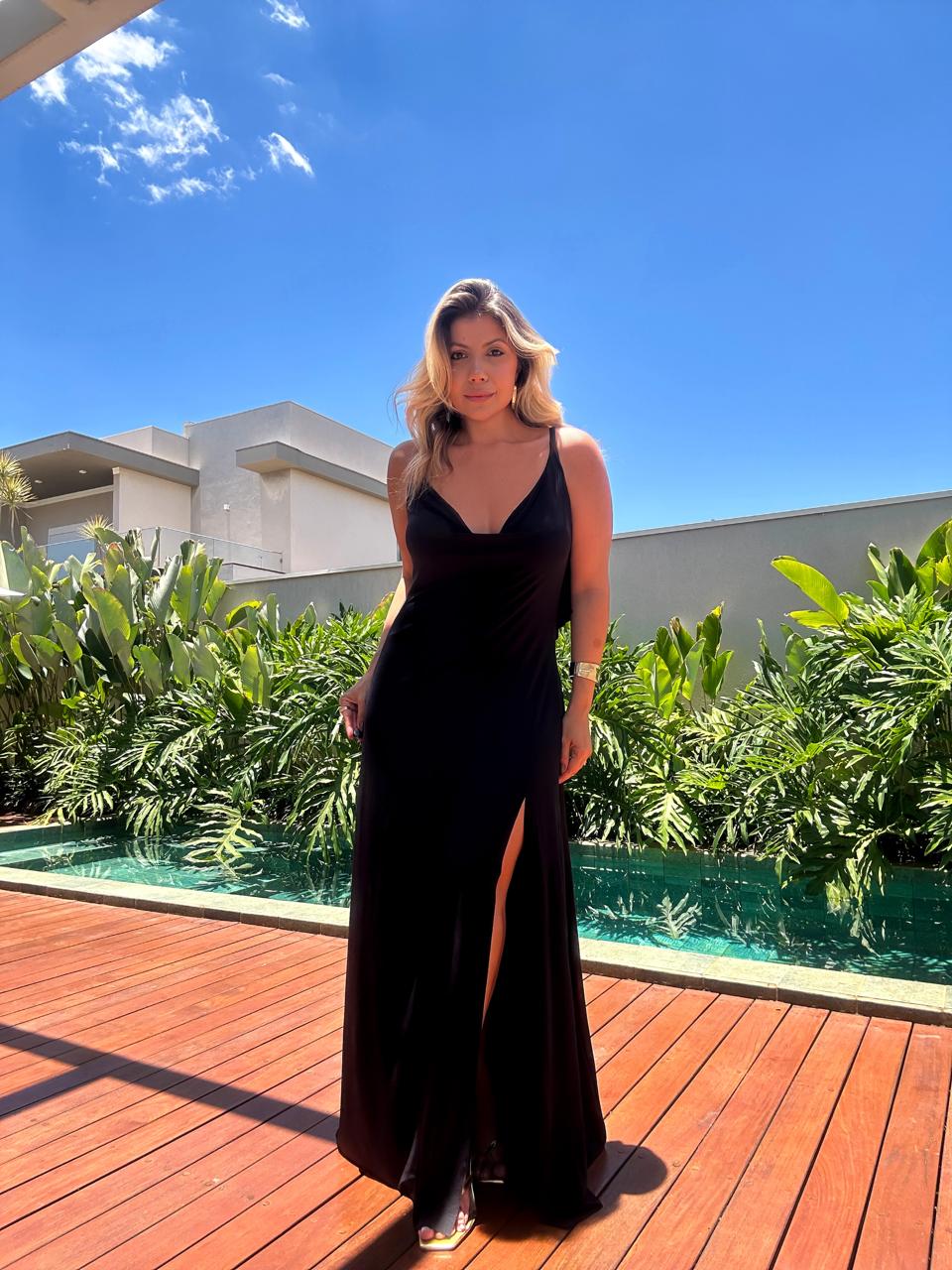 Vestido longo preto deslumbrante com fenda lateral, perfeito para ocasiões especiais. O modelo conta com alças finas e decote degagê suave na frente, criando um caimento fluido. Nas costas, o charme se intensifica com um decote em V, que valoriza a silhueta. O acabamento em babados nas costas acrescenta leveza e delicadeza ao look, deixando o visual ainda mais elegante. Confeccionado em poliamida, possui forro curto.
