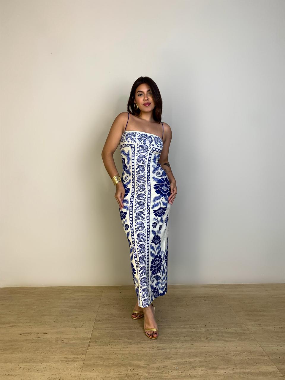 Vestido midi estampado farm une leveza e elegância em uma modelagem reta que valoriza a silhueta. Possui alças finas e decote reto e a estampa em tons de azul e off white inspirada nos tradicionais azulejos portugueses, trazendo um charme atemporal ao visual. Confeccionado em tecido canelado leve e confortável, é a escolha ideal para dias ensolarados, passeios especiais ou produções casuais cheias de estilo.