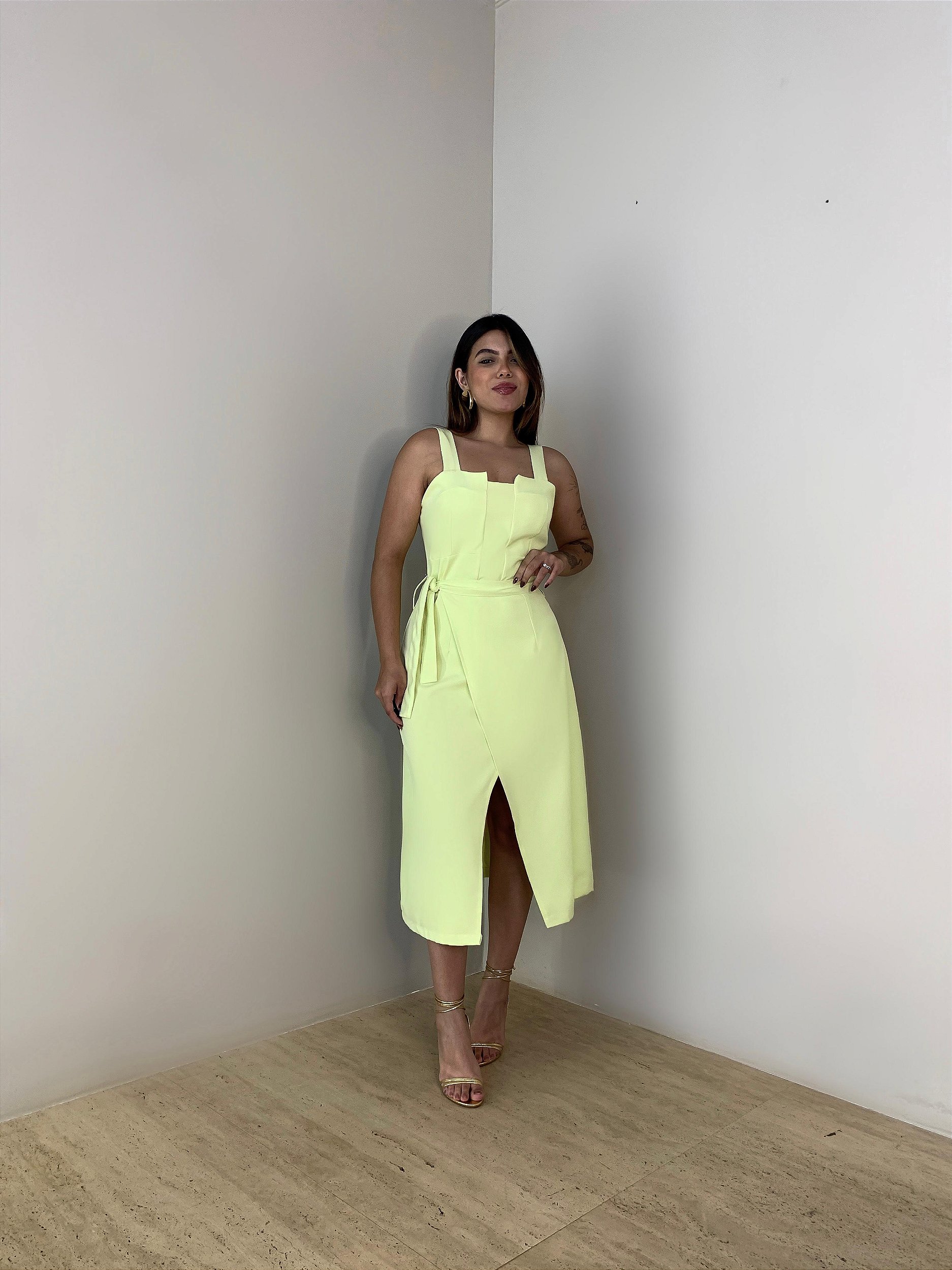 Vestido midi alfaiataria verde lima elegante e minimalista. Com alças e decote reto, ele valoriza a silhueta de forma sutil. Possui faixa para amarração na cintura e fenda frontal, tecido crepe spandex.