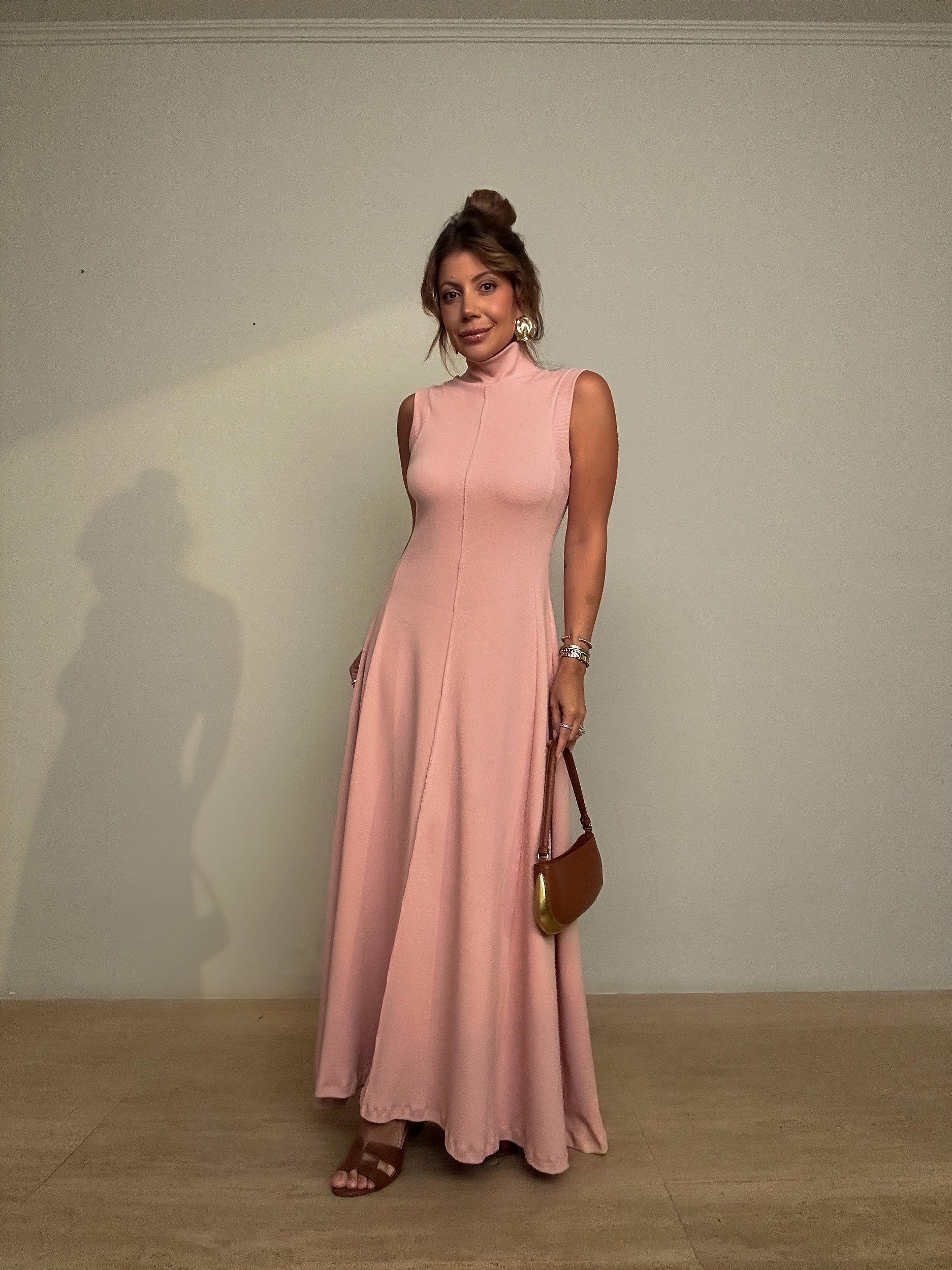 Vestido Midi alongado rosa chá, moderno e elegante.Confeccionado em ribana canelada encorpada, o modelo possui recortes estratégicos que valorizam a silhueta com sofisticação. A golinha traz um toque minimalista e atual, enquanto o design cavado garante leveza.