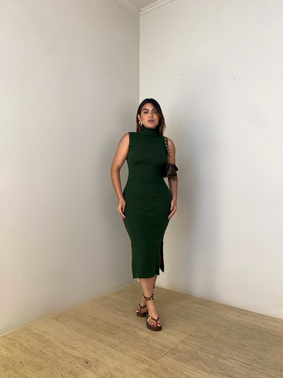 Vestido midi canelado verde, com gola alta que adiciona sofisticação e fenda lateral que garante mobilidade e charme ao visual. Modelagem ajustada que valoriza a silhueta, perfeito para combinações casuais com sandálias ou produções mais elegantes com salto e acessórios marcantes. Tecido malha canelada, não possui forro.
