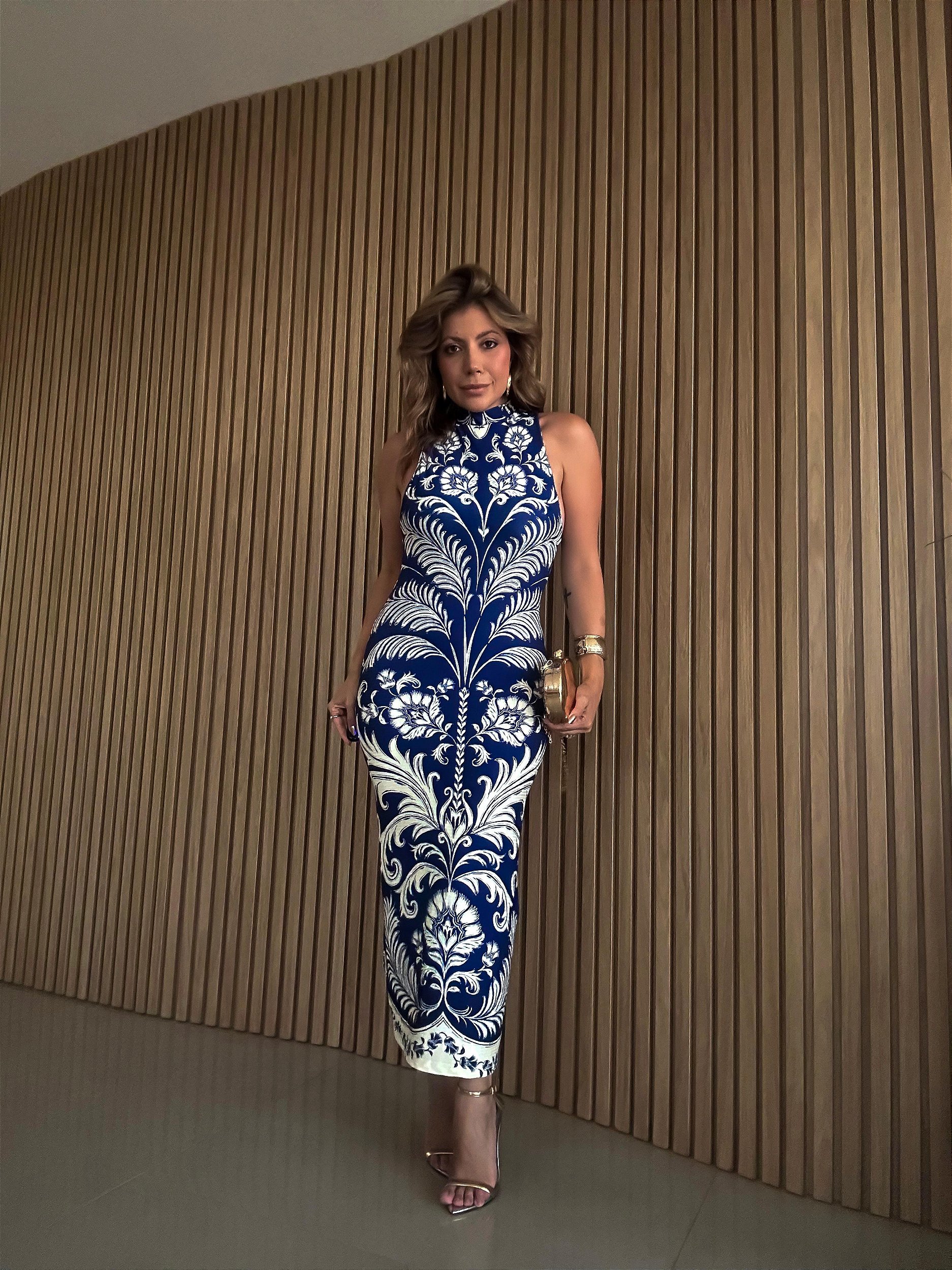 Vestido midi farm com estampa ornamental em tons de azul e off white, que traz um visual elegante e marcante. A modelagem ajustada valoriza a silhueta, enquanto o comprimento midi garante sofisticação e versatilidade. Possui decote fechado e gola alta. Confeccionado em malha canelada e com ótimo caimento, é ideal para composições que vão do casual chic a ocasiões especiais.