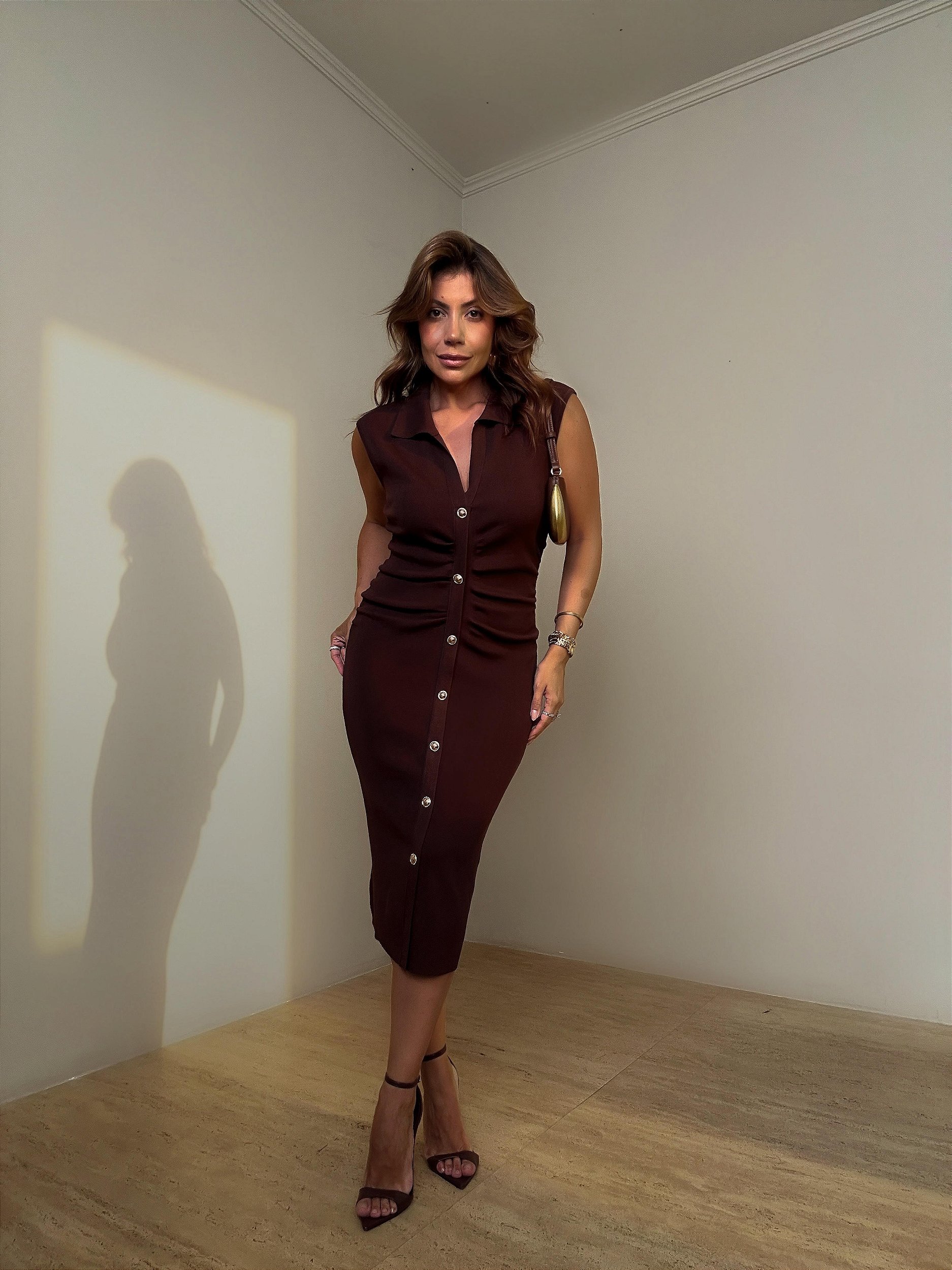 Vestido midi em modal marrom, com modelagem que valoriza a silhueta e traz elegância na medida certa. Possui decote em V, mangas curtas e detalhe de botões falsos frontais que alongam a peça e adicionam charme ao visual. O tecido em modal é macio, confortável e com ótimo caimento, além de se ajustar ao corpo com leve elasticidade.