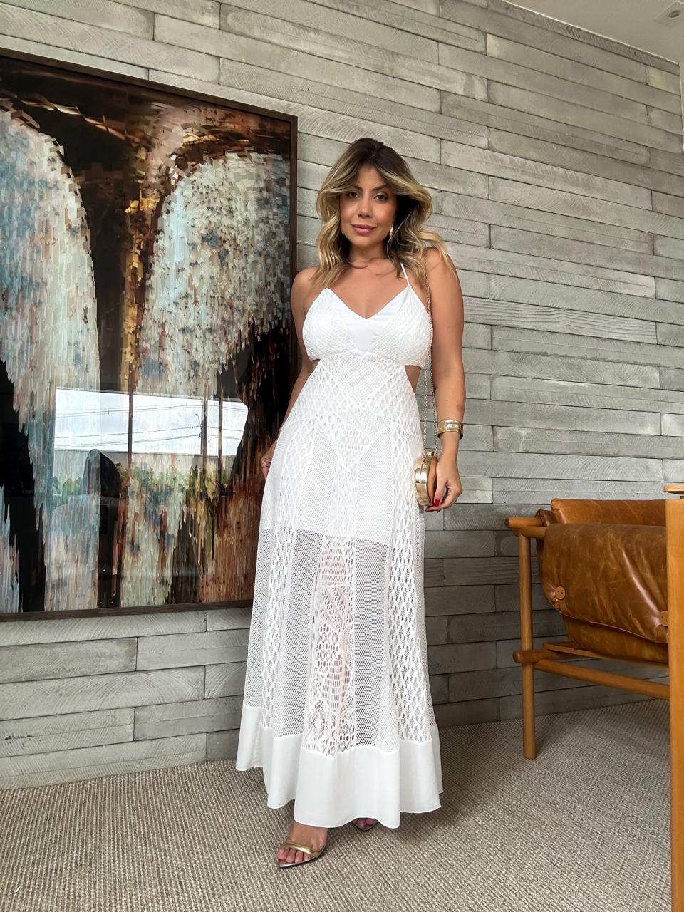 Vestido branco deslumbrante, com uma mistura perfeita de leveza e elegância. O modelo traz top com alças finas e decote suave, que valoriza naturalmente o colo. A cintura marcada e os recortes laterais criam uma silhueta feminina e moderna. A saia midi é o grande destaque: composta por camadas de renda e transparências estratégicas, ela oferece um visual romântico.